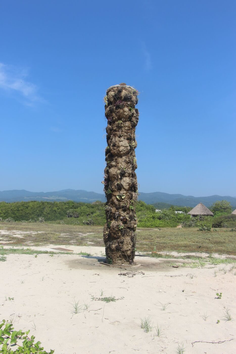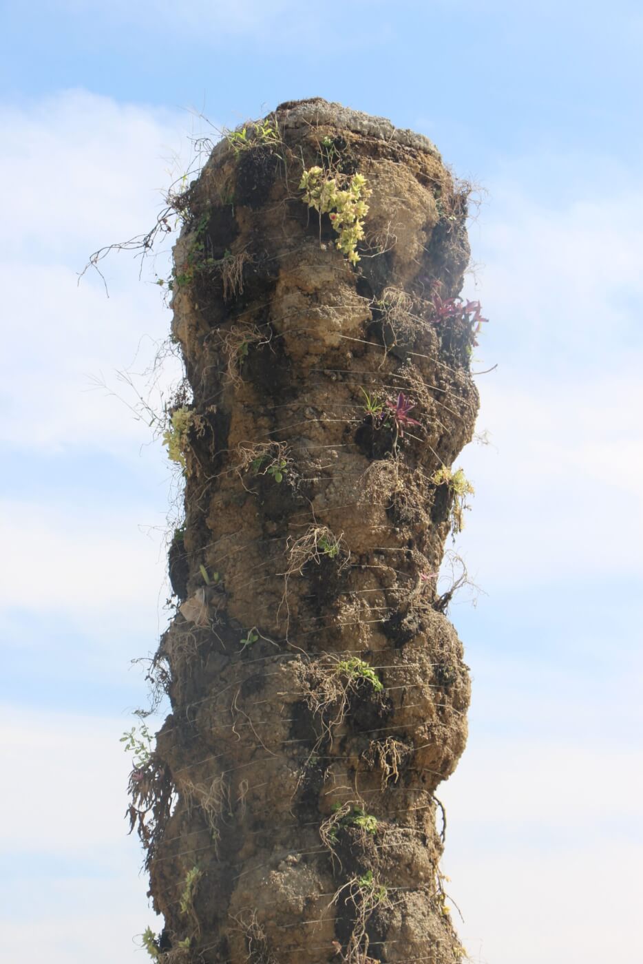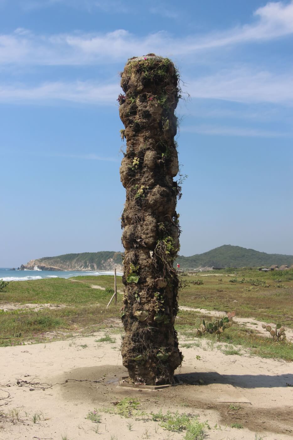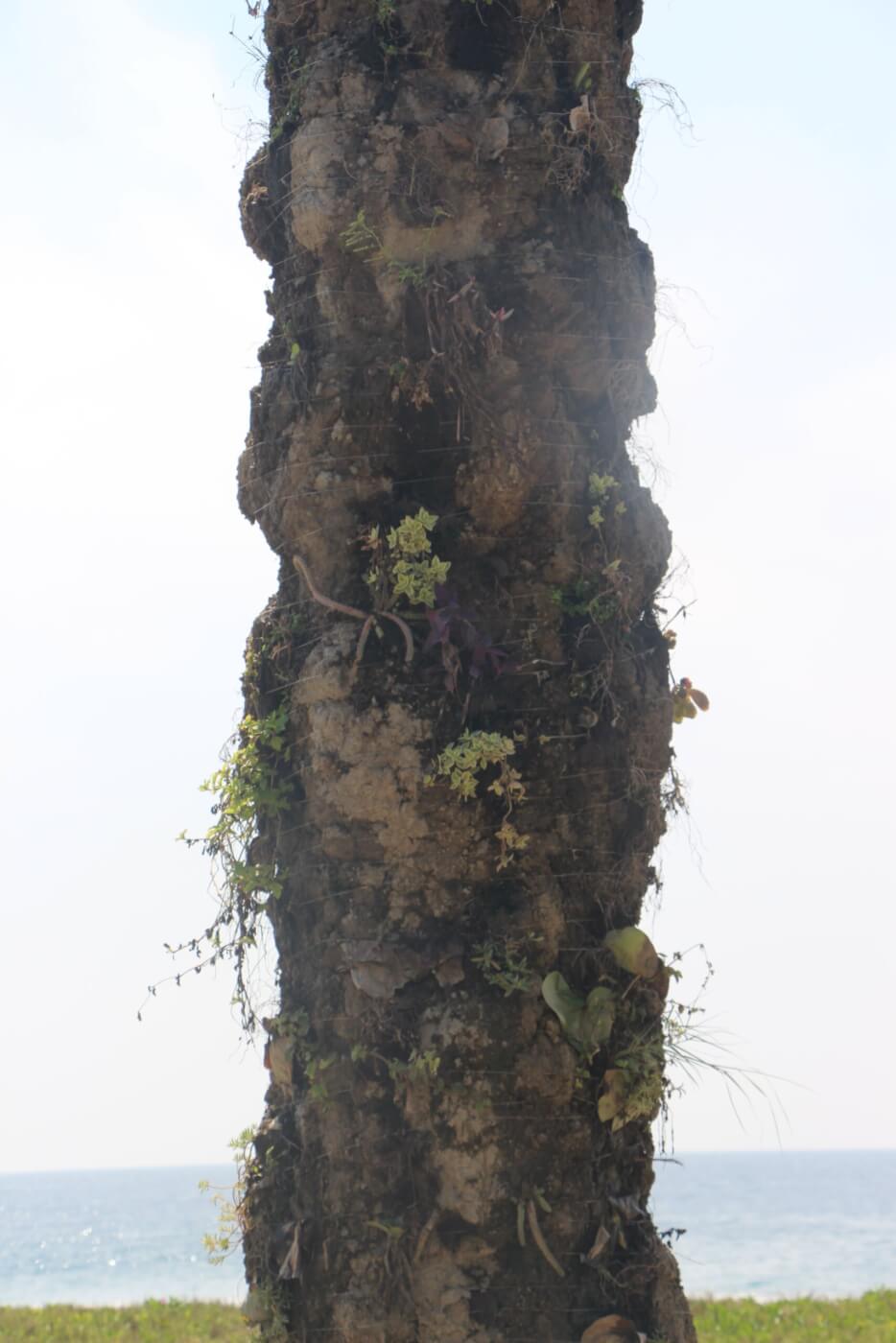 Situada entre el mar y las montañas se inspirada en el mundo natural que la rodea, la escultura de concreto de 4.5 metros de altura alberga un jardín vertical con una variedad de especies de plantas que incluyen orquídeas, bromelias, cactus, higueras trepadoras, entre otras.