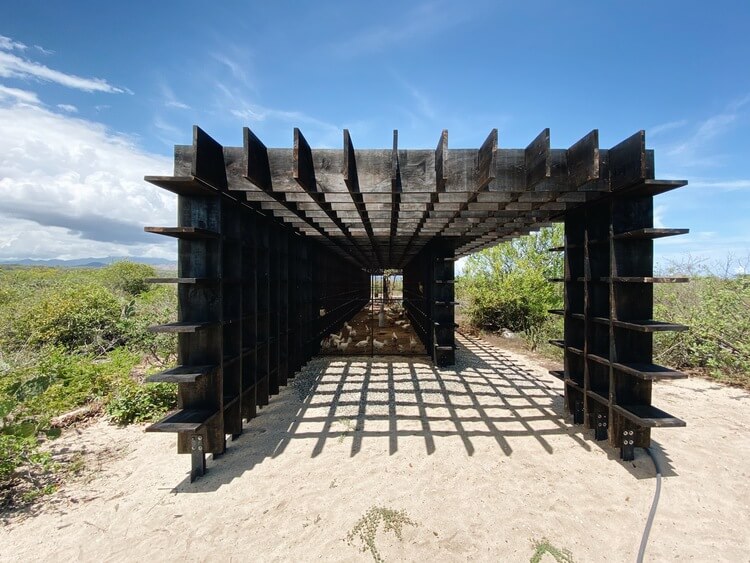 Japanese architect Kengo Kuma conceives the Chicken Coop as a representation of collective housing. The structure is built from charred wooden boards following the traditional Japanese technique of Shou Sugi Ban which is intended to contrast with the environment of the mexican beaches. The project gives way to a permeability in walls and ceilings that provides shade and ventilation to the chickens that inhabit it. The eggs are used as part of the sustainability program in the kitchen of the Foundation and the Hotel Escondido.