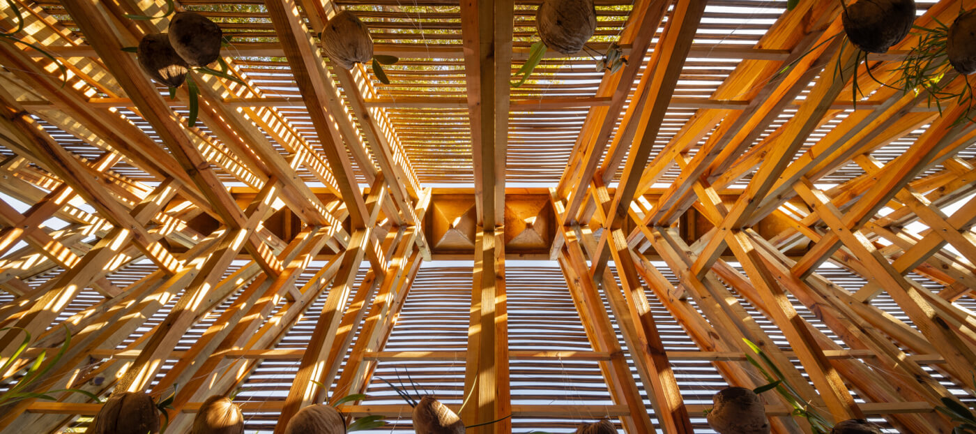 Secondly, the pavilion employs simple construction materials and techniques, including locallysourced wood and custom-made clay ceramic pieces baked in high-temperature kilns.