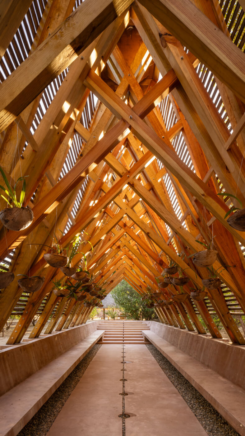 on the outskirts of Puerto Escondido, between the sea and the mountains. It is a wooden structure, permanent, sustainable, and lightweight, dedicated to the conservation of orchids in the Oaxaca region, which highlights the strong relationship between the biological and cultural diversity of the landscape.