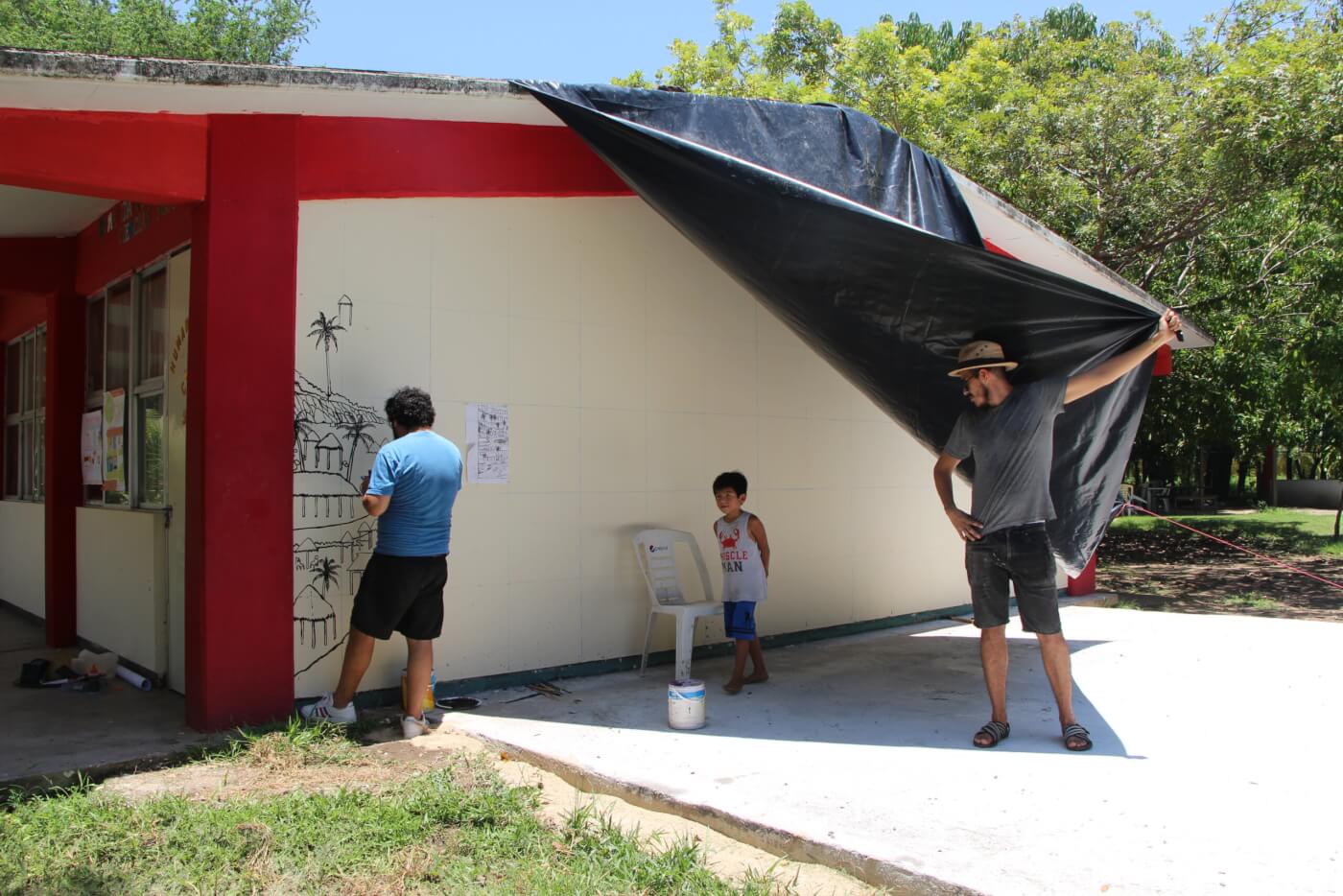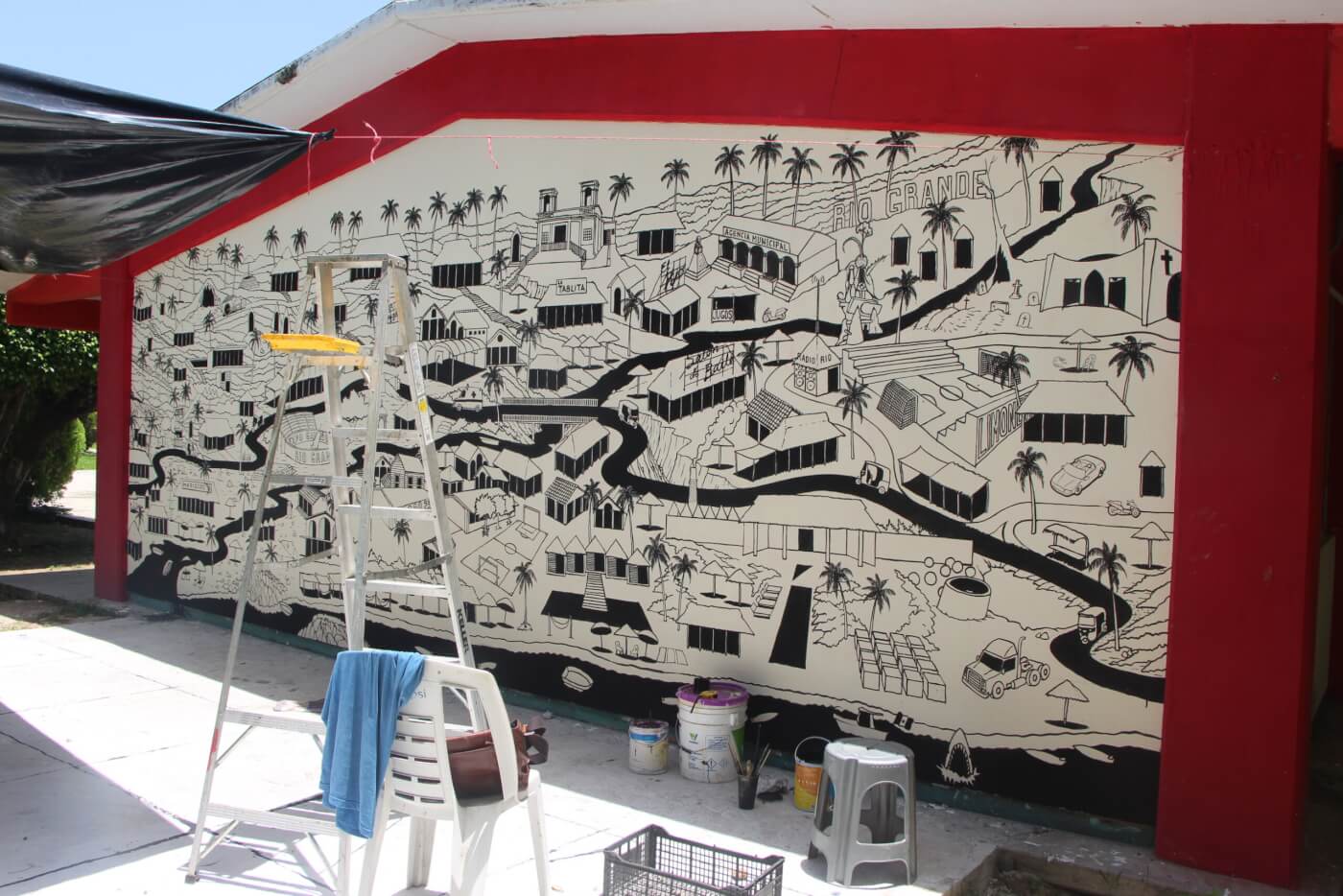 A pictorial intervention portrays the urban landscape of Río Grande. The composition highlights the main spaces of this community and its surroundings, including Casa Wabi and the Manialtepec lagoon. The mural is designed to be intervened by students, which have a kit of stamps that represent people or animals, so that each participant can take a portrait in them and paste their sticker within the space of the pictorial intervention.