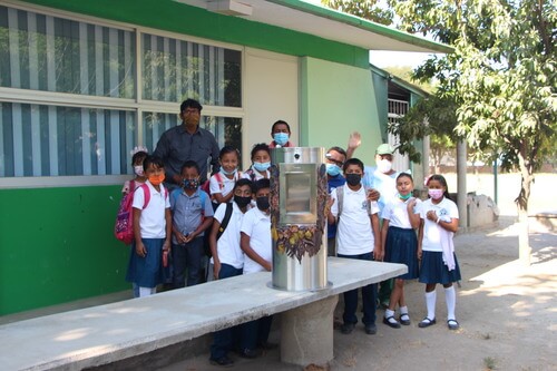As part of a joint project between Fundación Casa Wabi and Teka México to provide access to clean water in schools, a water dispenser was intervened with ceramic creations and glazed in various colors. Taking advantage of the opportunity presented by the establishment of a cafeteria at Lázaro Cárdenas Elementary School in the community of Río Grande, this sculptural and functional piece is integrated into the school landscape, providing a direct benefit to the population.