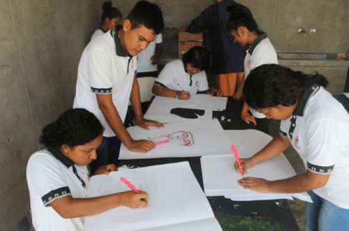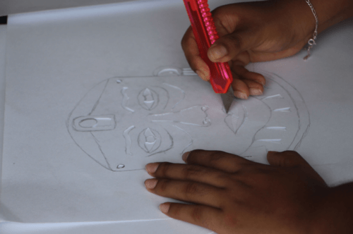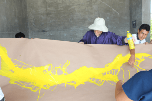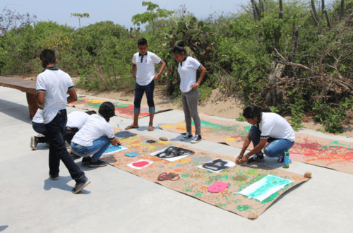 The project’s objective was to sensitize attendees about the historical and cultural value of the pre-Hispanic pieces found in their community and throughout the Mexican territory. Taking borrowed pieces from the collection of pre-Columbian figures that they have at COBAO, the participants were invited to do an exercise using their imagination. They made imaginary drawings that depicted how the figures would look if they were not broken or in fragments while discussing the importance of keeping the pre-Hispanic cultures that lived in the coastal area. As well as why it is indispensable to maintain and preserve the pieces for their historical and cultural value. From the drawings created in the workshop, cardboard stencils were made with which several large-format paintings were made using techniques such as graffiti or gravity painting, making each piece a group work.