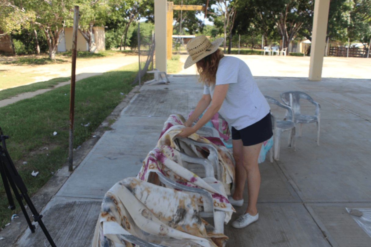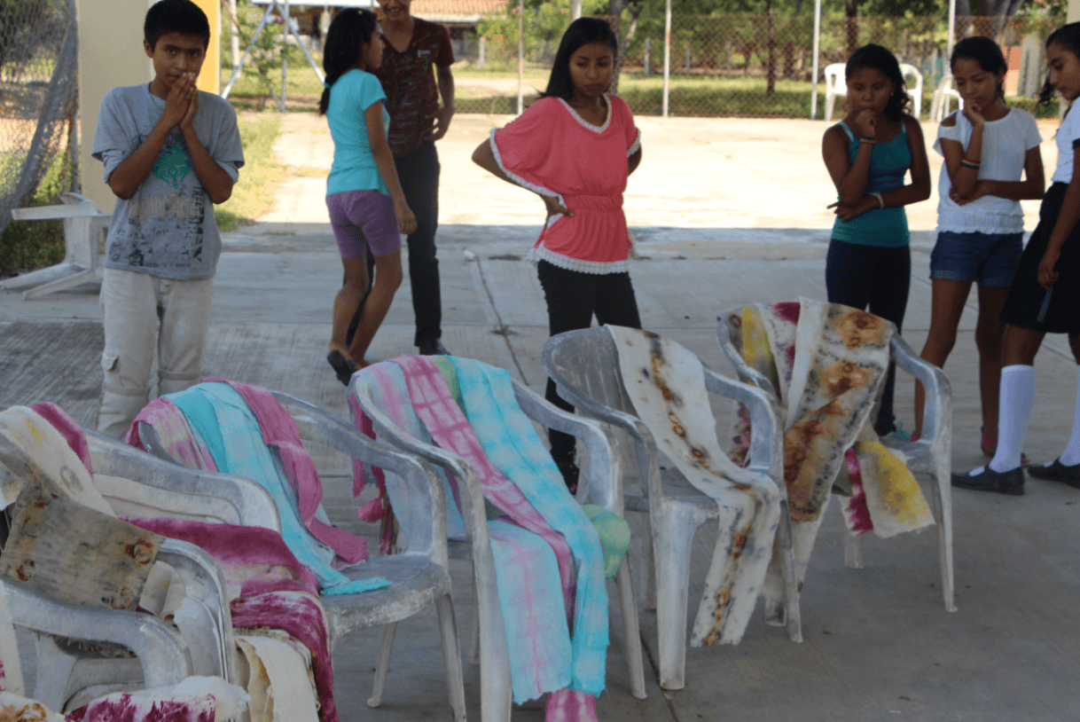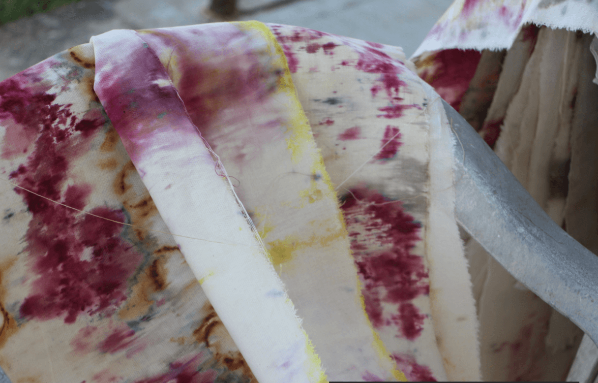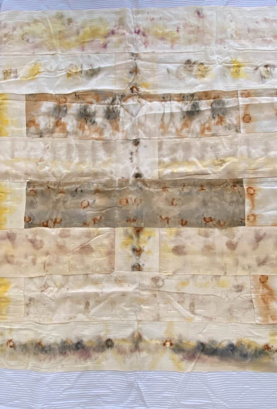 In the first sessions, Marita showed a Japanese dyeing technique called Shibori, using chemical dyes each participant dyed a shirt for themselves and pieces of cloth that would be used for the assembly of a joint piece. In the next sessions, each student returned with their t-shirt already finished, then they proceeded to learn another dyeing technique using direct transference of natural elements on more pieces of fabric. For the final piece, coffee, turmeric, chili powder, metal, Jamaica flowers, and black tea was used. The last session served to assemble 4 pieces that interwind all the previous pieces that were dyed throughout the sessions.
