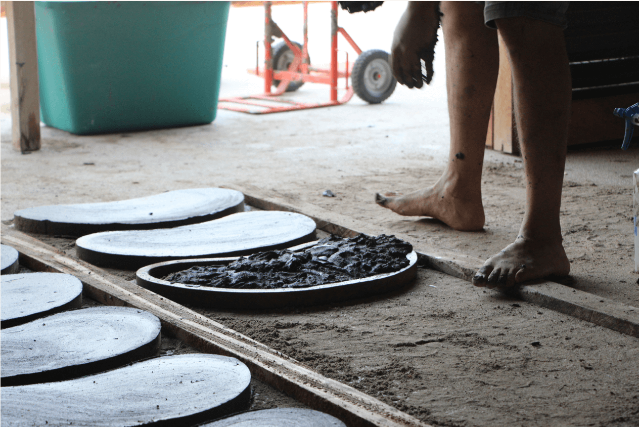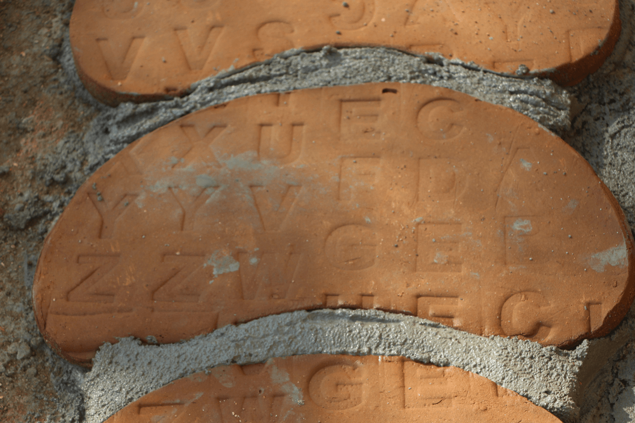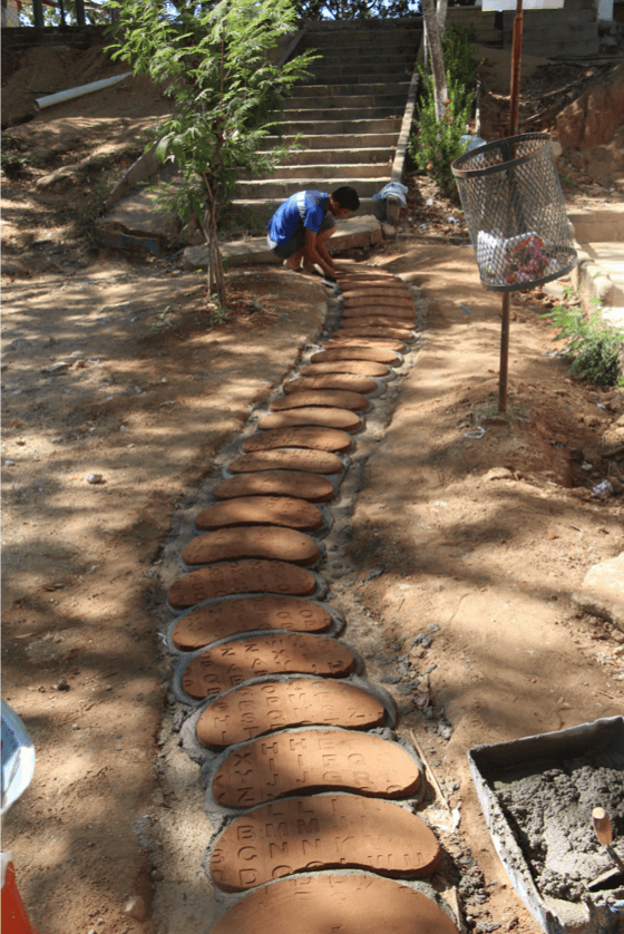 The project aimed to create a road made with pieces of clay, which are adorned with a low relief that imitates an alphabet soup, built at the school facilities. This path connects the main courtyard of the school with the green areas. To create this piece, large bean-shaped clay tiles were used, alluding to one of the basic components of Mexican food, which were engraved using a rolling machine, designed by the same resident.