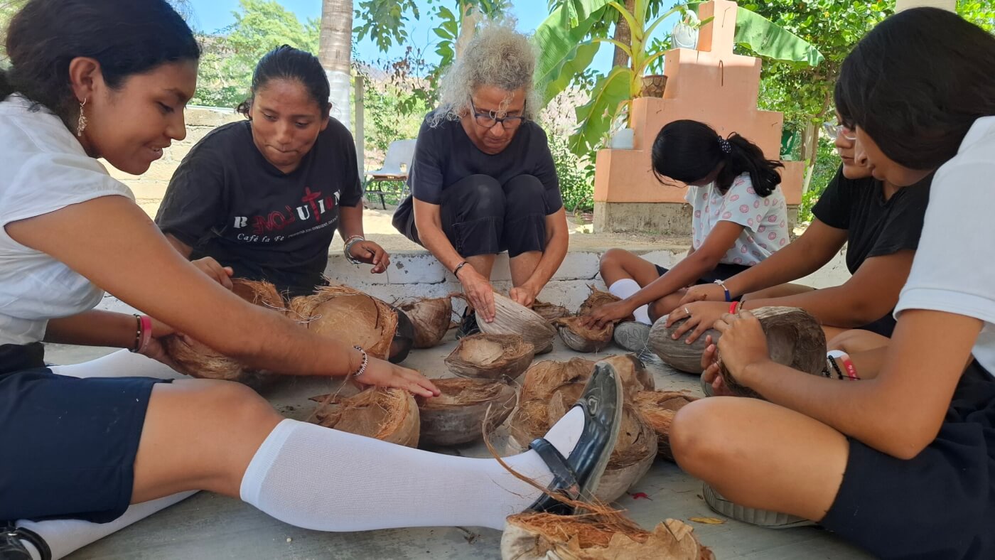 The “Cáscara Viva” project was carried out at the Aguaje el Zapote Technical Secondary School and consisted of building a modular structure woven with coconut shells. It allowed participants to interact with their environment in a new way while engaging them in an experimental and hands-on process of imaginative construction—a playful space that invites movement, interaction, and exploration.