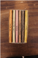 Six notebooks in a cardboard box, painted with natural dyes.