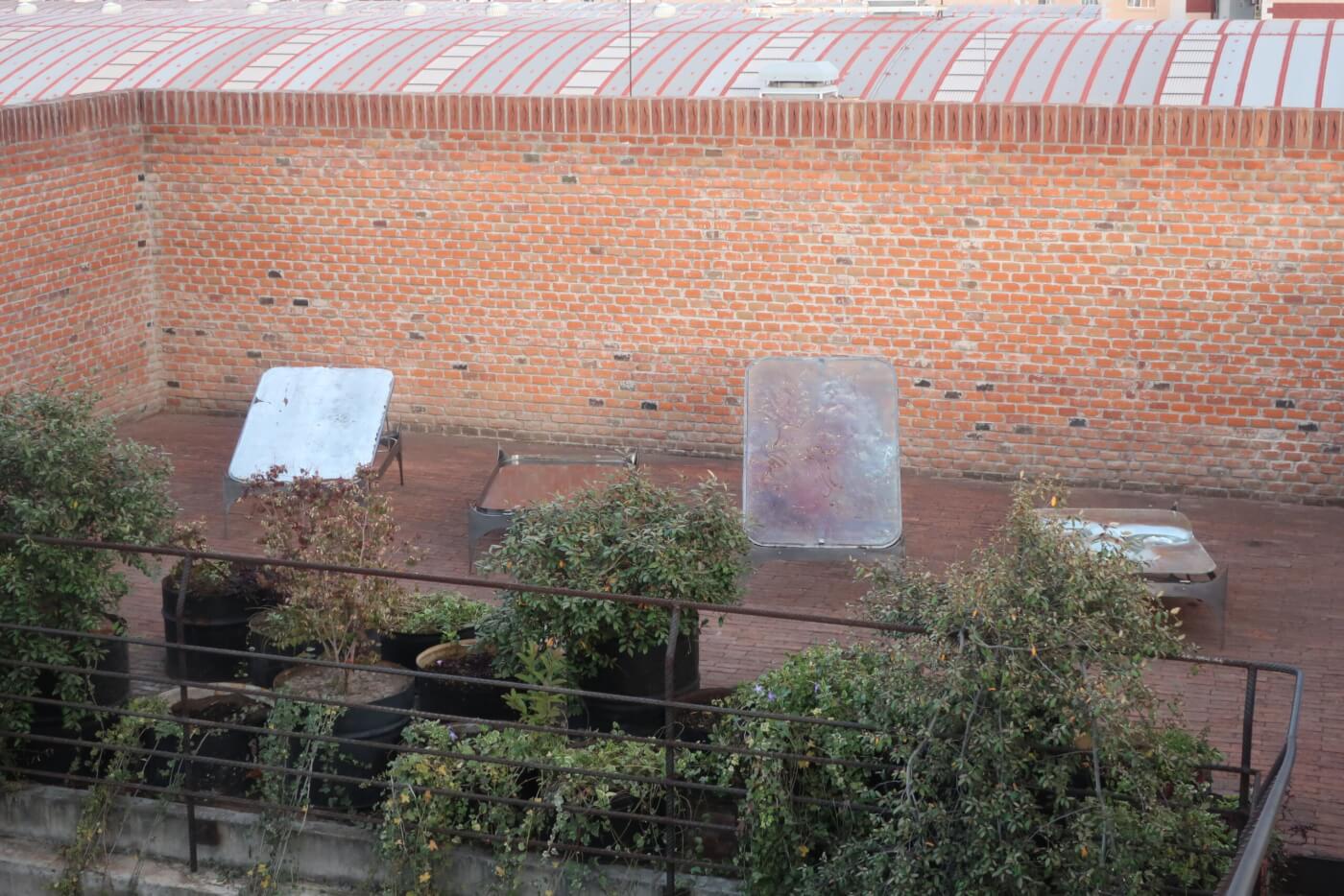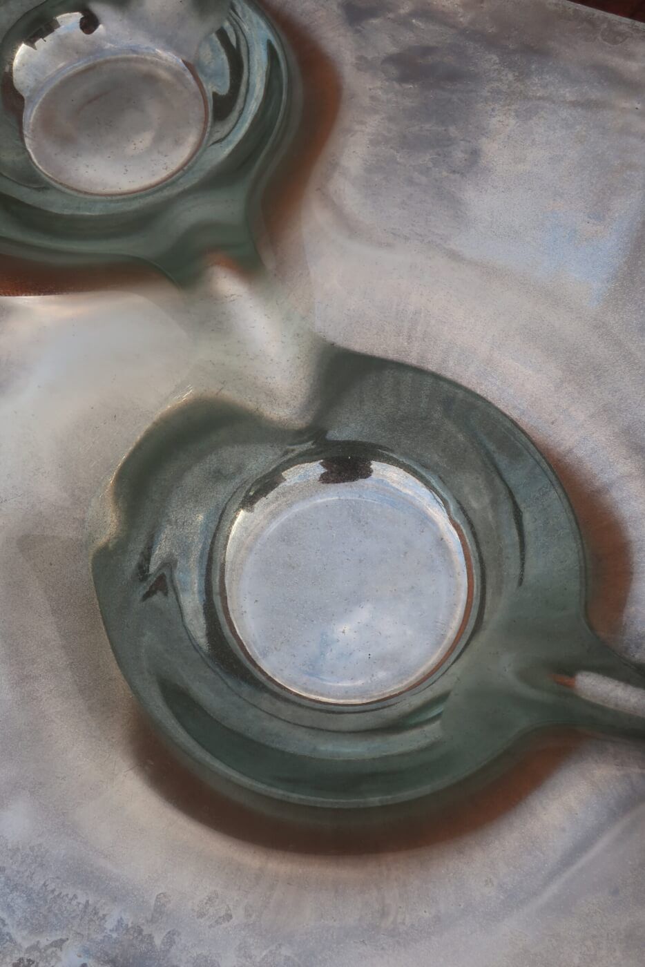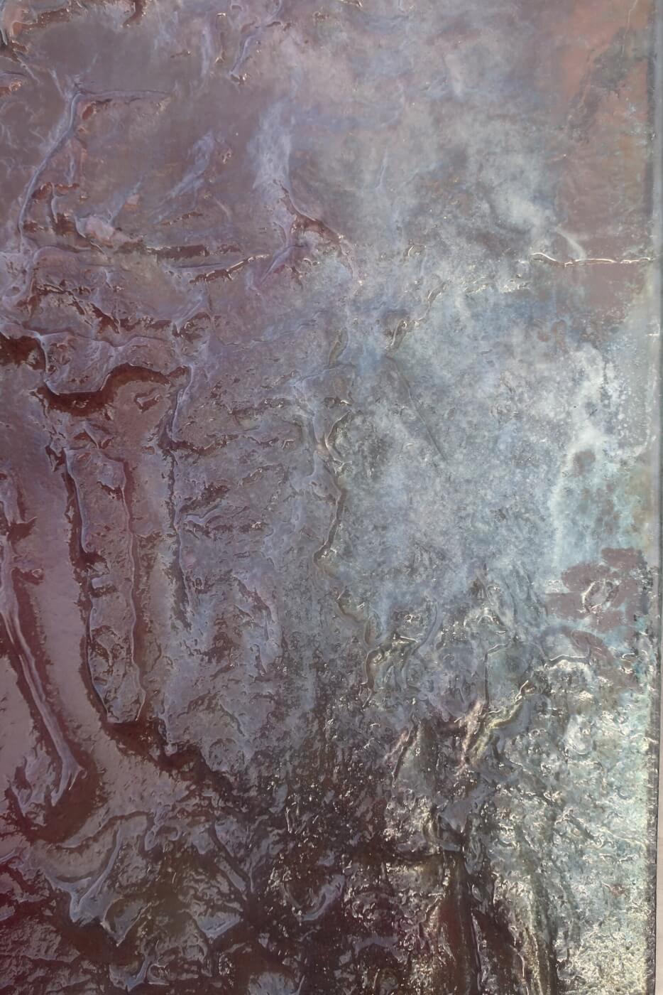 Cuatro piezas nos reciben en la terraza. Su apariencia extraña, nos invita a acercarnos y detenernos en su contemplación preguntándonos qué es ese material de cualidades inciertas: una especie de líquido solidificado cuyas texturas, colores y reflejos podrían remitirnos a paisajes diversos o imaginarios; o quizá simplemente nos convocan a rendirnos ante lo desconocido y apreciar su materialidad mas allá de la búsqueda de entendimiento.
