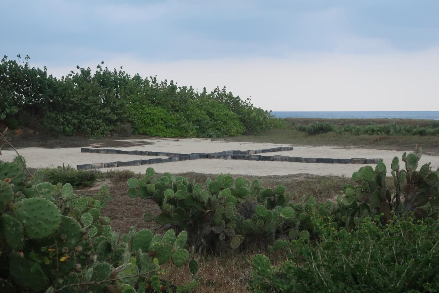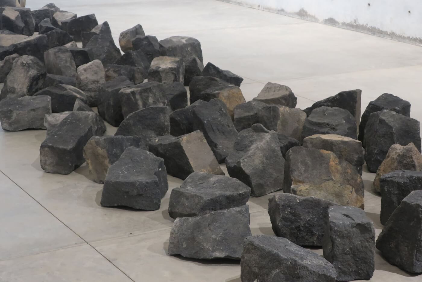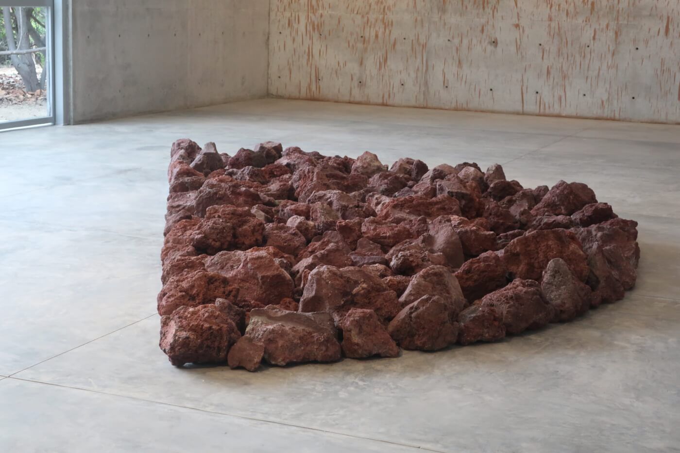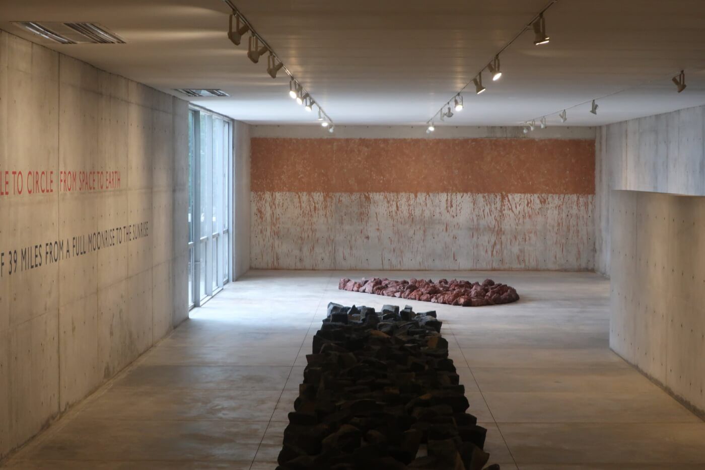 Las obras aquí expuestas dan cuenta del interés de Long por el territorio mexicano, país que ha recorrido en distintas ocasiones desde la década de 1970. Piedras volcánicas de los valles centrales de México y lajas de pizarra provenientes de Puebla son acomodadas| en el espacio de Casa Wabi de manera sencilla, recurriendo a formas geométricas elementales, de modo que el gesto humano y las cualidades formales inherentes a los materiales se convierten en el eje central de la obra. Es en las caracteristicas de las piedras donde reside la belleza y la poética de las piezas. Algo similar ocurre con la obra mural realizada con tierras de la costa de Oaxaca, en la que el color y la textura del material resultan tan significativos como el movimiento perceptible de la mano del artista. El trabajo de Long se sostiene en un diálogo constante entre el hallazgo y la voluntad: entre la acción de encontrar las piedras y la experiencia de ser encontrado por ellas. Esta relación guía la realización de las piezas, que combinan una atención cuidadosa a los aspectos formales —la presencia y el carácter de las piedras, el color de la tierra— con una práctica conceptual en la que el gesto y la escala humana ocupan un lugar central.
