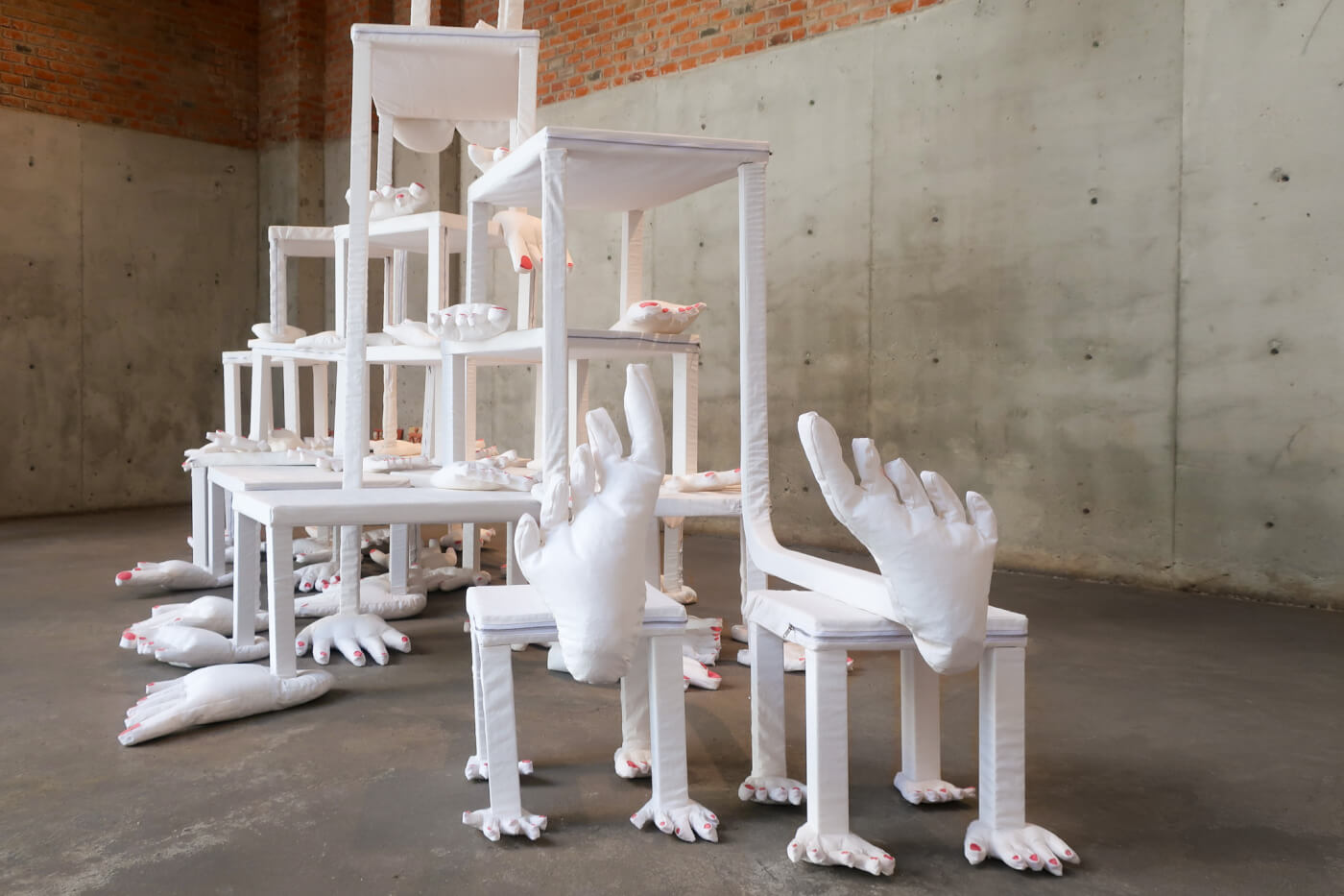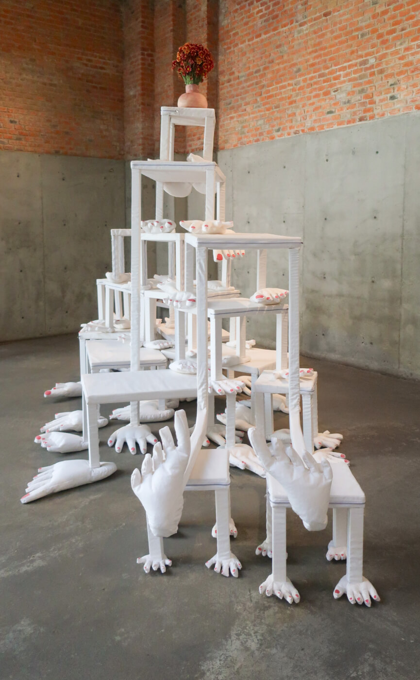 En esta estructura, donde la inestabilidad se hace presente, todo aquello que incomoda -la angustia, el desasosiego- lo que no encuentra su lugar se condesa en estos cuerpos detenidos en un gesto, como animales congelados en medio de la sala, para mostrar la complejidad de las emociones humanas, la paradoja de sostener y cuidar cuando todo esta a punto de derrumbarse.
