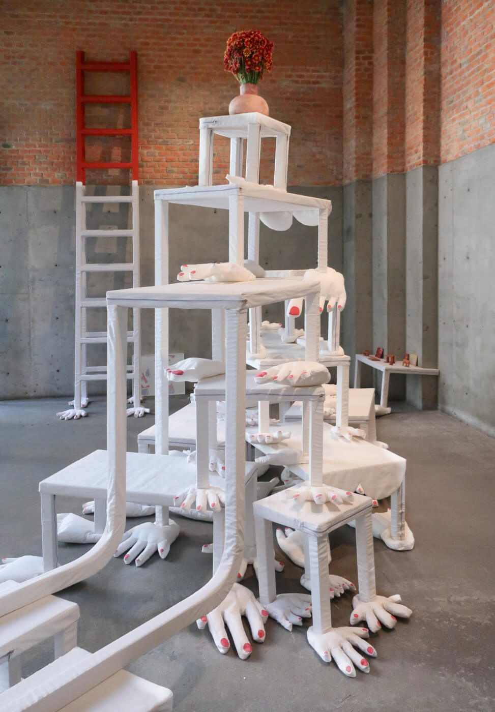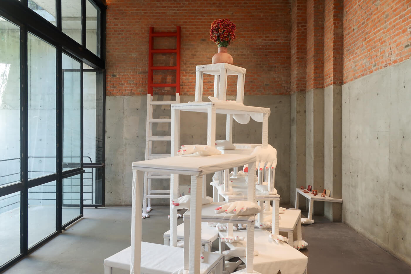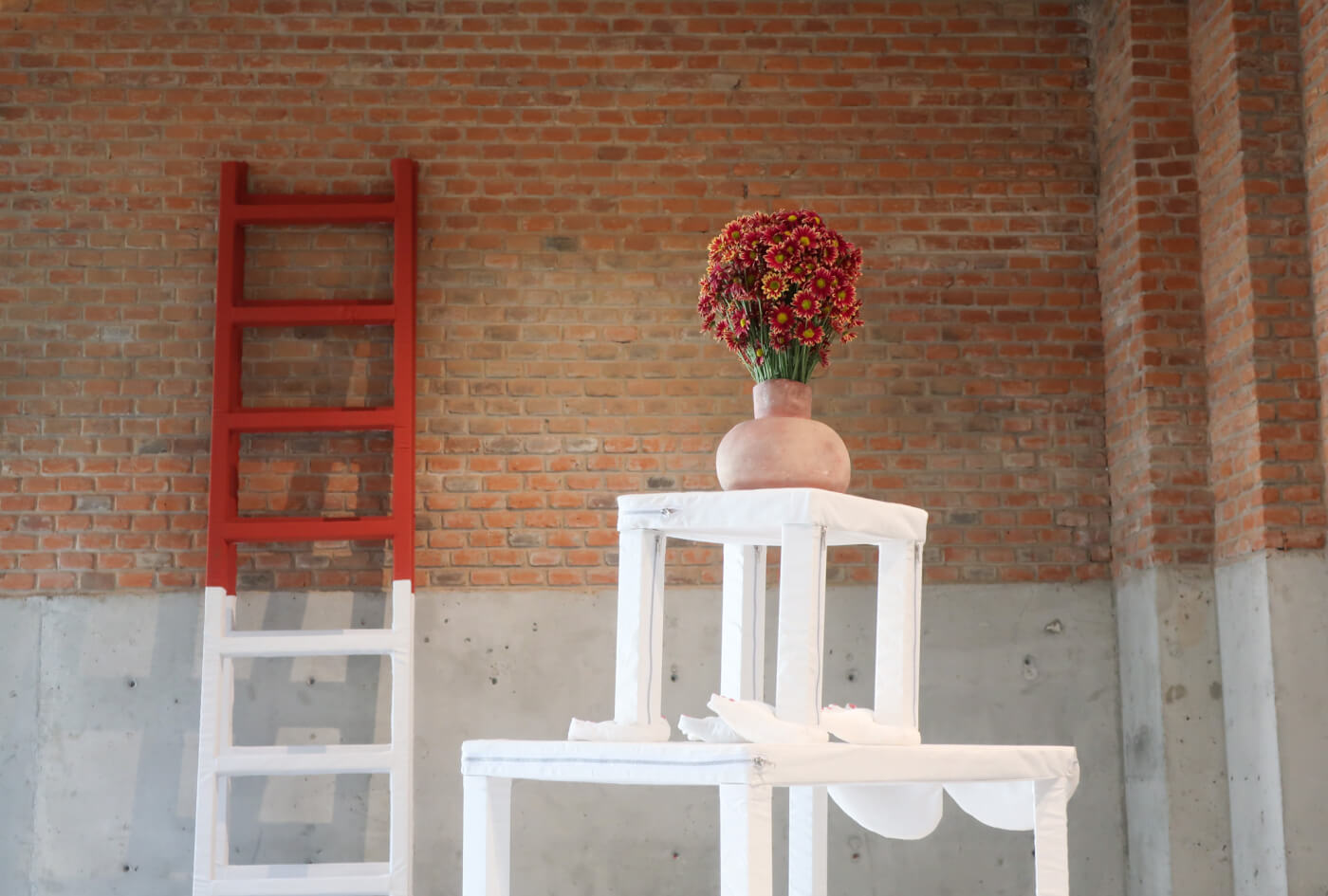 Una mesa de centro articula el área común de la casa, puede ser un lugar de reunión formal, o un espacio de juego infantil, que con solo un poco de imaginación puede convertirse en un fuerte, un castillo o una cueva. Para Umaña, la mesa de centro y los objetos que orbitan en torno a ella son testigos silenciosos de conversaciones, celebraciones y duelos. Estos seres animados, animales imaginarios de cuatro patas se detienen inmóviles, en medio de la sala para sostener un ramo de flores. Sin embargo, da la sensación que si te despistas posiblemente cambien de lugar.