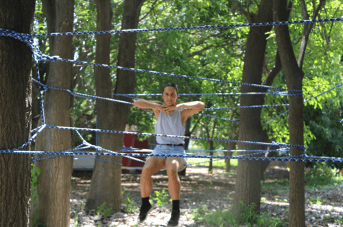 Se adhirieron al muro fotografías en tamaño real de algunos alumnos del colegio, los cuales aparecen tirando de una cuerda, que va de lo bidimensional a lo tridimensional, esta cuerda se termina enredando en un conjunto de árboles para generar un área de juego.
