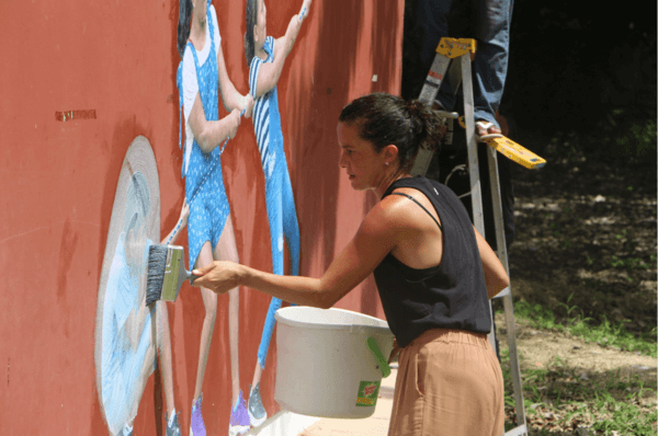 Celina realizó una intervención dentro de la escuela primaria “Jaime Nunó” de la comunidad de Río Grande. Se trató de un proyecto híbrido, que se compone de una intervención pictórica sobre dos edificios de salones de clase y una instalación hecha de soga en la que los niños pueden jugar y trepar.