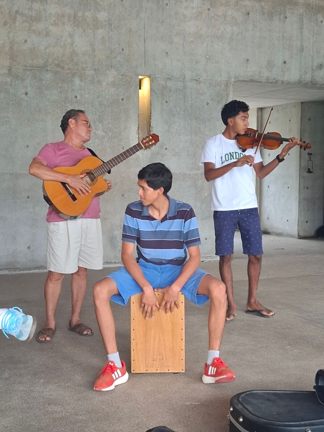 Los ejercicios incluyeron prácticas de escucha activa, tanto hacia los sonidos del entorno como hacia las emociones. La improvisación musical se combinó con imágenes generadoras, palabras y sonidos cotidianos, fomentando nuevas conexiones creativas. Las sesiones concluyeron con una improvisación colectiva que permitió a los participantes experimentar estados de conexión, trance creativo y momentos de comunión con el todo.