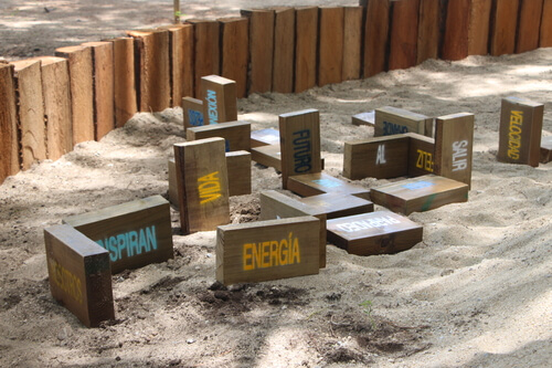 Intervención escultórica y lúdica dentro de las áreas verdes de la Primaria Lázaro Cárdenas en Río Grande. Bajo la sombra de un gran árbol de parota se formó un circuito de juego compuesto por dunas de arena, columpios, trapecios, un juego de bloques de madera con los cuales formar palabras o poemas y un mural sobre uno de los inmuebles del colegio.