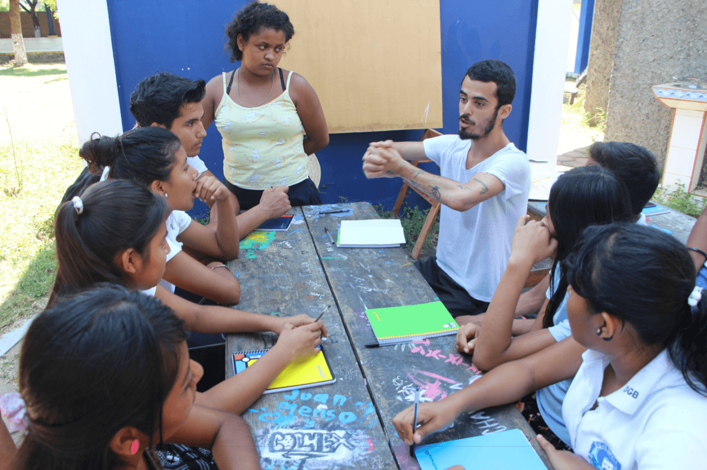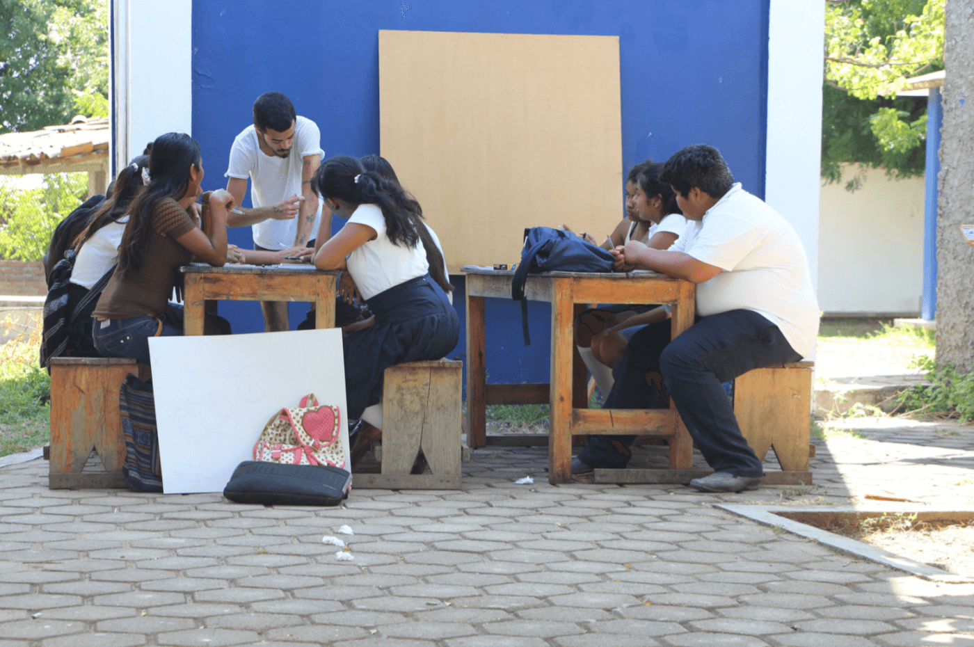 Introducción a la convivencia del individuo con formas y lineamentos abstractos para generar aterrizajes concretos que reflejen el poder del símbolo-idea por encima de lo meramente estético y así generar un placer introspectivo y una fuerza mental. Cada uno descubrió un estilo propio desde un inicio y esto me sorprendió. Los dibujos generados encima del mural fueron inicio de un discurso interesante entre todos: cada uno de nosotros es un ser en potencia. De los dibujos me inspiré en mis piezas personales. Mis piezas articulan entorno a la importancia simbólica de la imagen y su impacto en el cuerpo. Hice cruces para acercarme a una fe que no contengo. Hice animales para adaptarme al entorno. Hice formas femeninas y mortuorias para representar el conocimiento.