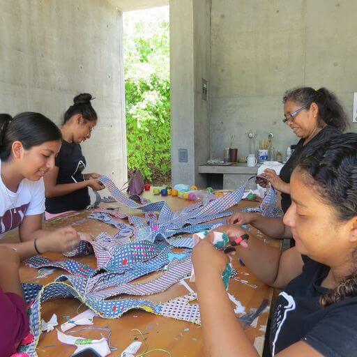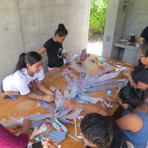 Mi idea es construir en conjunto con las mujeres que trabajan en la cocina de Casa Wabi, junto a sus hijos, un mural textil. Utilizamos un tejido de palma comprado en el mercado, la técnica de bordado de punto cruz de la mamá de Rosi y las bases de costura sobre tela que traje desde Chile. La idea fue tejer esta pieza en conjunto, donde pudimos compartir técnicas e ideas acerca del tejido, pero al mismo tiempo poder compartir costumbres, historias y ritos que cada persona tiene en torno a una historia. Este textil es una plataforma y el escenario donde podemos compartir nuestras ideas, costumbres y sueños.