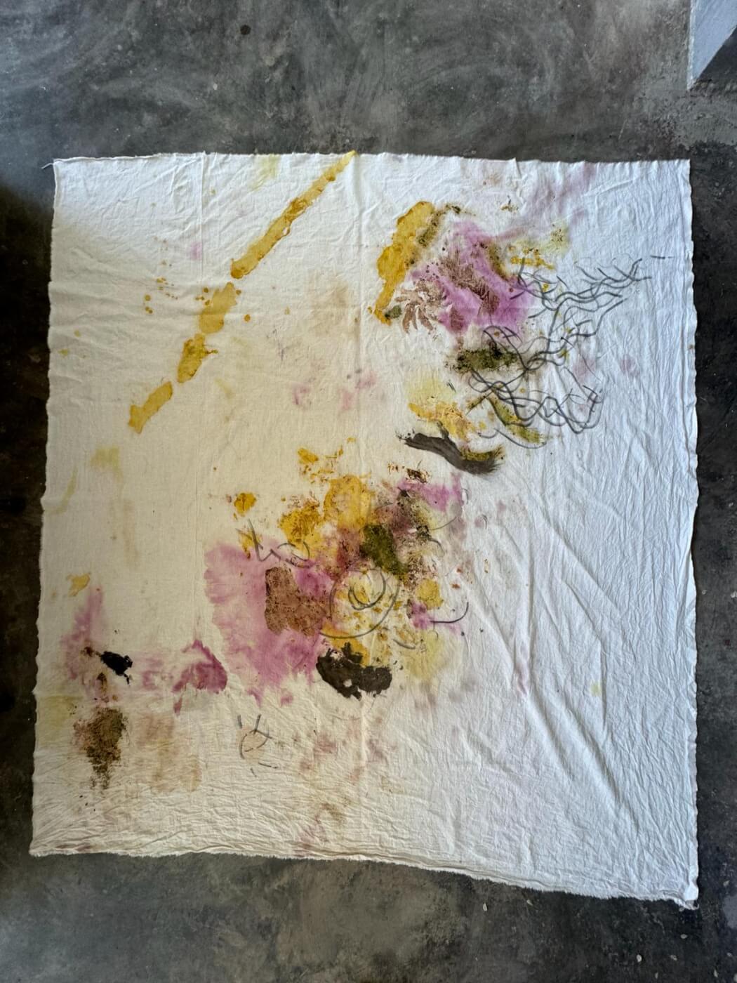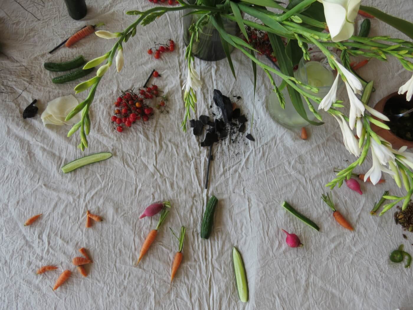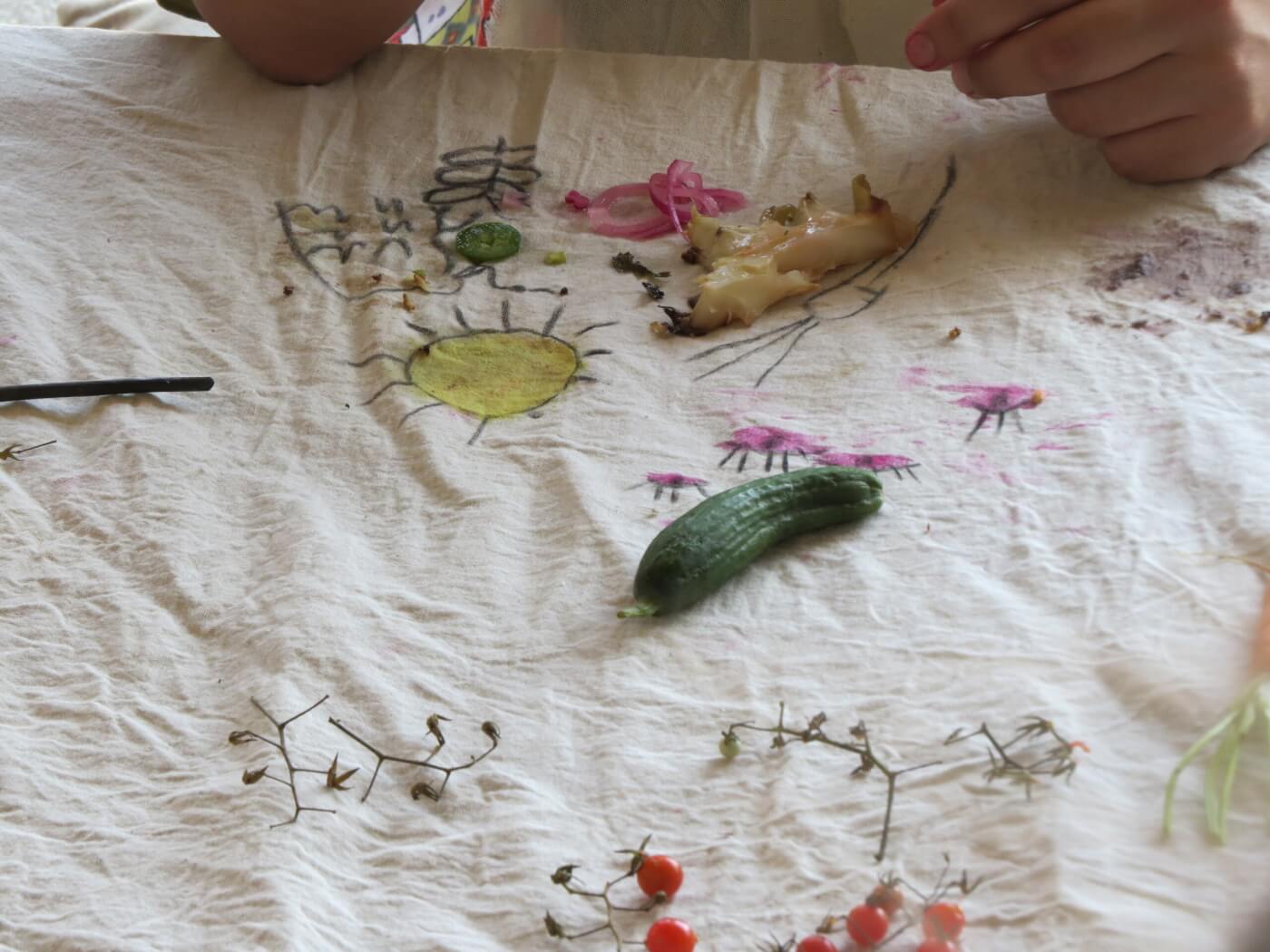 El objetivo de “Food Performance” fue crear una comida lúdica, donde los participantes comen con las manos sobre un lienzo y este va formando diferentes capas de color y textura. La actividad busca reunir a la gente en un espacio seguro y conectar a través de los alimentos. Se incluyeron multitud de productos locales, fruto de la investigación durante la residencia y el performance incluyó música y distintos estímulos sensoriales.