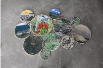 Fotografías impresas sobre poliester e intervenidas con pintura vinílica, bordado e incrustaciones de chakira, enmarcadas con bastidores circulares de madera.