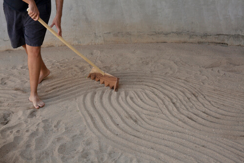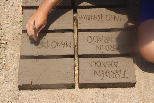 La instalación está delimitada con una cortina de palma traída desde San Isidro Llano Grande, la enmarcación del arenero está conformada por tabiques creados de manera artesanal en la comunidad de Agua Zarca, las herramientas de madera para realizar los dibujos sobre la arena se fabricaron en la comunidad del Venado y la arena y las piedras del jardín se trajeron del río de la comunidad de Hidalgo; esta pieza es de alguna forma una panorámica de las comunidades con las que se trabaja continuamente dentro de la fundación.