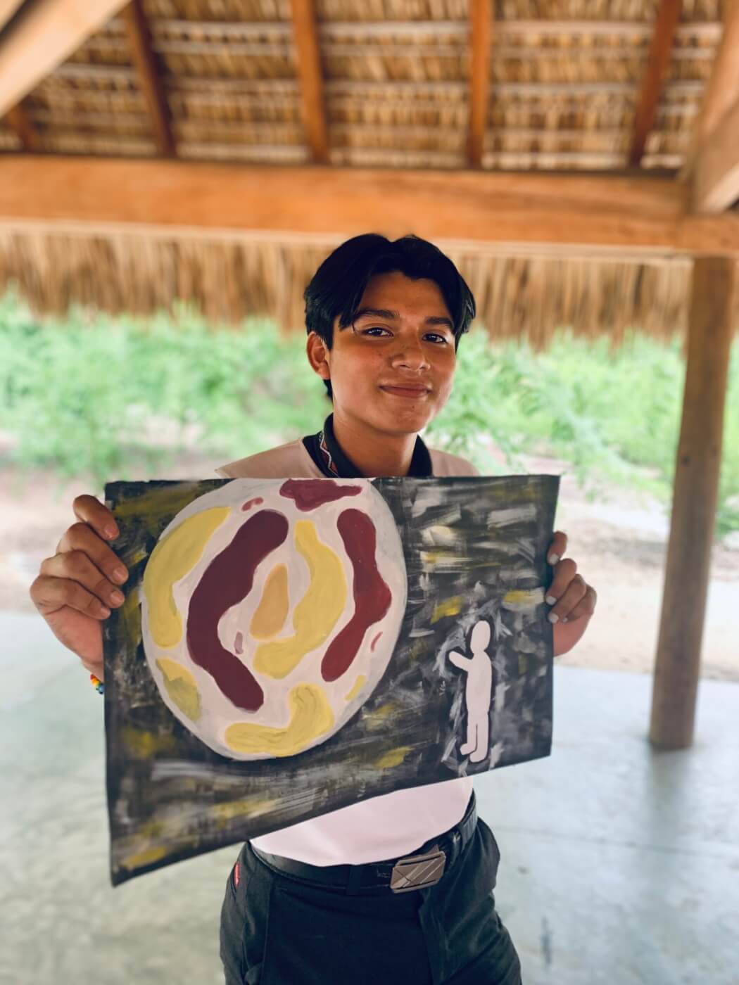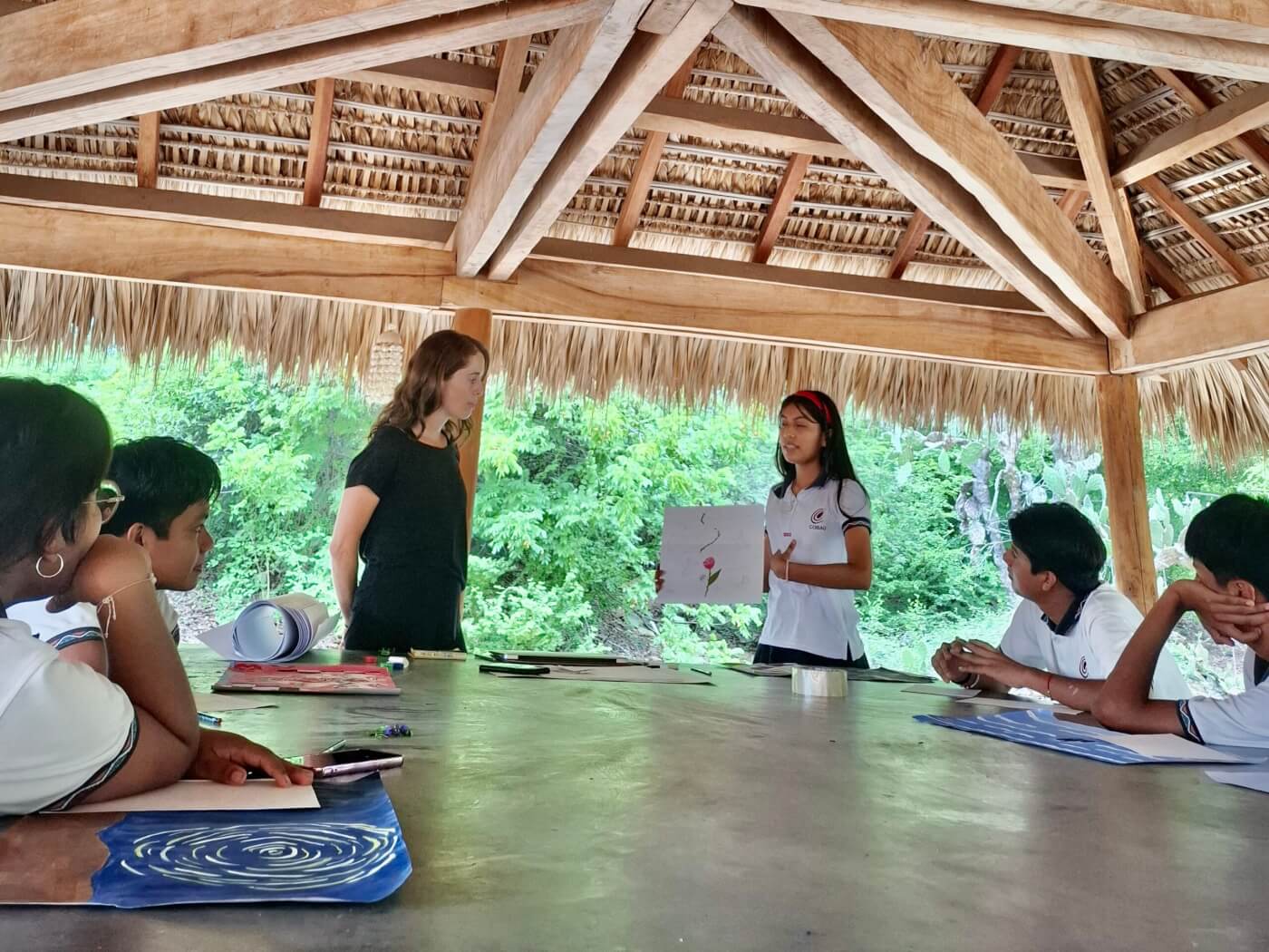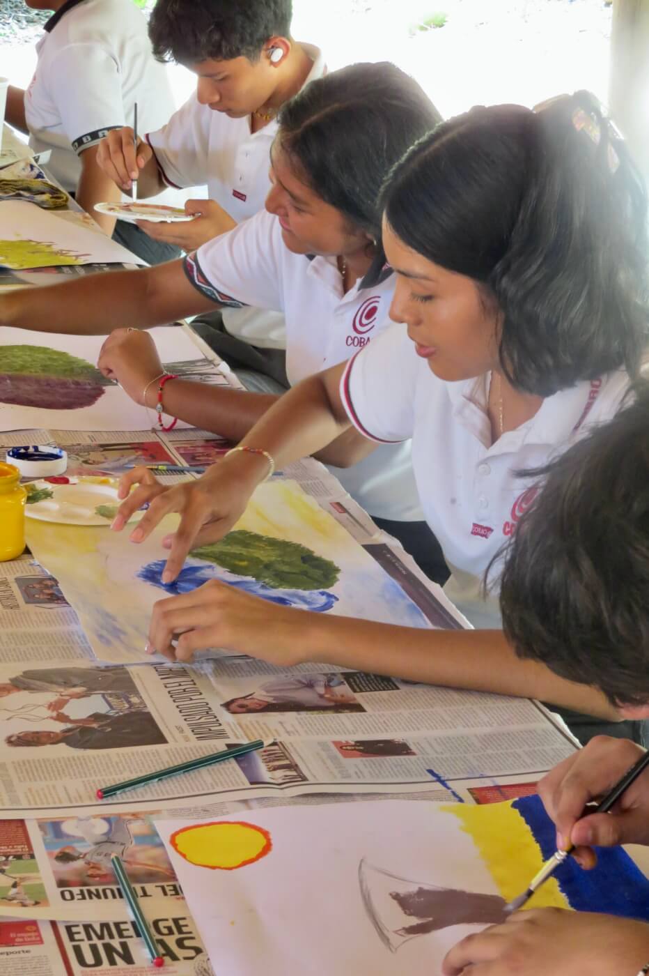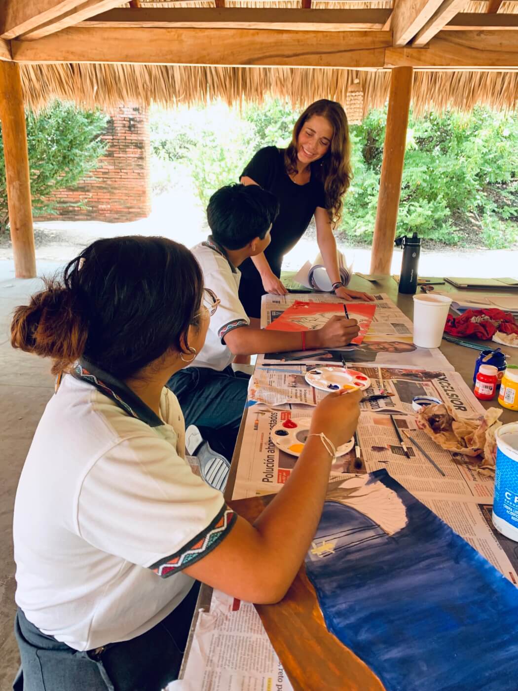 Othiana Roffiel impartió el taller «Mundos exteriores, mundos interiores: creación pictórica a través de la conciencia corporal» a un grupo de jóvenes de bachillerato del COBAO No. 40, en la comunidad Bajos de Chila, Oaxaca. En él, durante cuatro sesiones, a partir de una serie de dinámicas corporales como caminatas, ejercicios de respiración y meditaciones, se promovió la práctica de la atención plena en los participantes, quienes pudieron entrar en sintonía con la naturaleza (cielo, tierra, minerales, animales, vegetales, etc.) y con sus propias sensaciones corporales (emociones, pensamientos, sensaciones, estados de ánimo, etc.), entendiendo el cuerpo como el umbral donde se enlazan ambos mundos, para, a partir de ello y con la finalidad de fortalecer su creatividad, aproximarse a la expresión pictórica desde un lugar más intuitivo. Al finalizar el taller, los jóvenes montaron sus trabajos sobre un muro, componiendo una obra colectiva, a partir de la cual compartieron sus experiencias de procesos creativos y de aproximación a sus propios mundos.