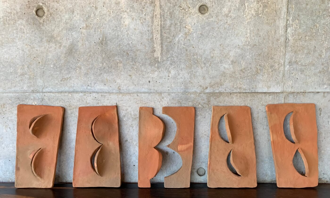 «Esta pieza de barro, producida durante mi residencia en Casa Wabi (agosto-septiembre de 2024), explora cómo elementos originalmente correspondientes a mi lenguaje pictórico reverberan en lo escultórico; en este caso, dos curvas que, en sus múltiples interpretaciones, pueden remitir a partes del cuerpo o del paisaje. A su vez, hay un diálogo entre los componentes, creando una especie de ritmo con posibilidades de variación, dependiendo del orden y sentidos que puedan adoptar. Cada componente fue creado utilizando el molde de una teja, elemento producido localmente en la comunidad de Agua Zarca, lo cual conecta los procesos de creación personal con la comunidad donde éstos tuvieron lugar.»