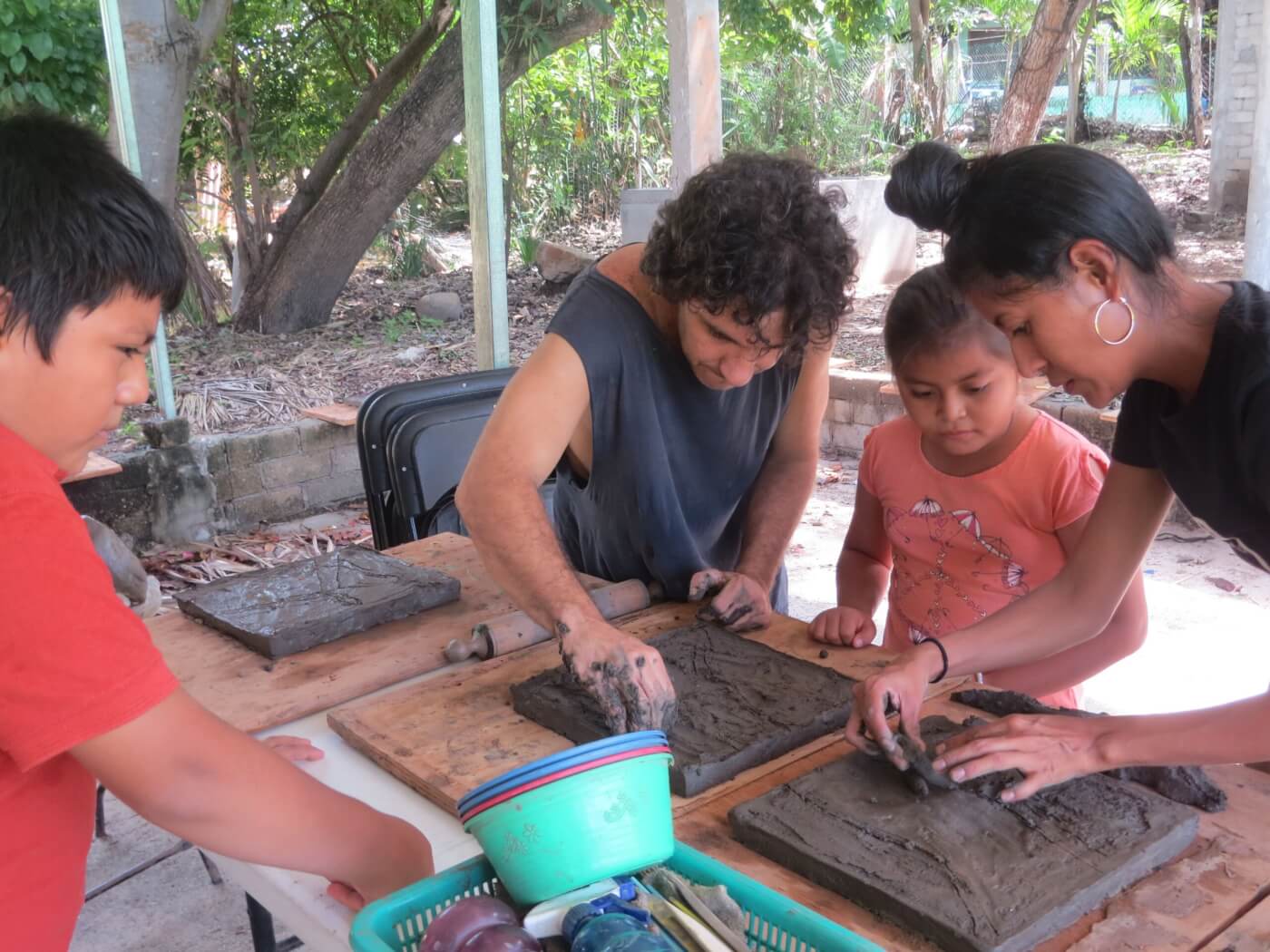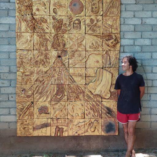 En un segundo encuentro, estas anotaciones se compartieron con el grupo y se reelaboraron, aún en papel, como imágenes (dibujos). En este momento se habló sobre la relación entre las imágenes, cómo pueden conectarse las ideas, deseos, miedos, etc. En el tercer encuentro, pasaron al trabajo con la cerámica. El artista y el grupo crearon placas de cerámica que, aún húmedas, fueron dibujadas y esculpidas por el grupo, manteniendo la regularidad de los módulos. Cada persona pasó tiempo esculpiendo/dibujando uno o dos módulos individualmente.