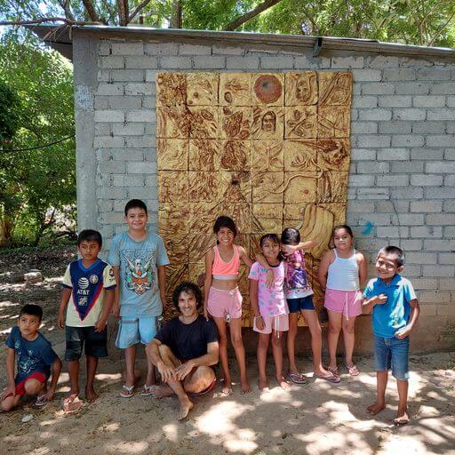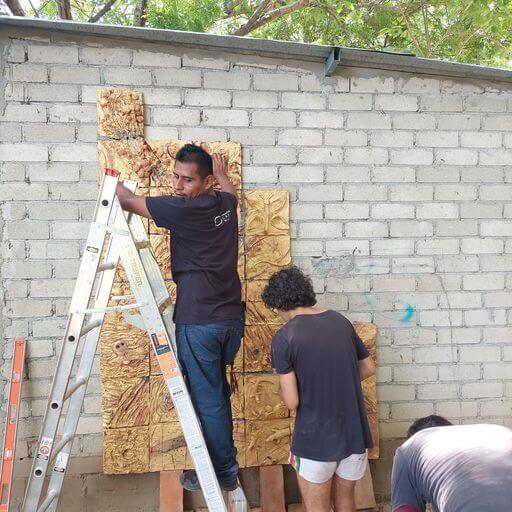 En una cuarta sesión, estos módulos fueron ensamblados por todo el grupo, y en este momento se pudieron hacer intervenciones más libres en las piezas para fortalecer el conjunto del panel. En un último encuentro, la obra se montó de forma permanente en el lugar de encuentro del grupo.