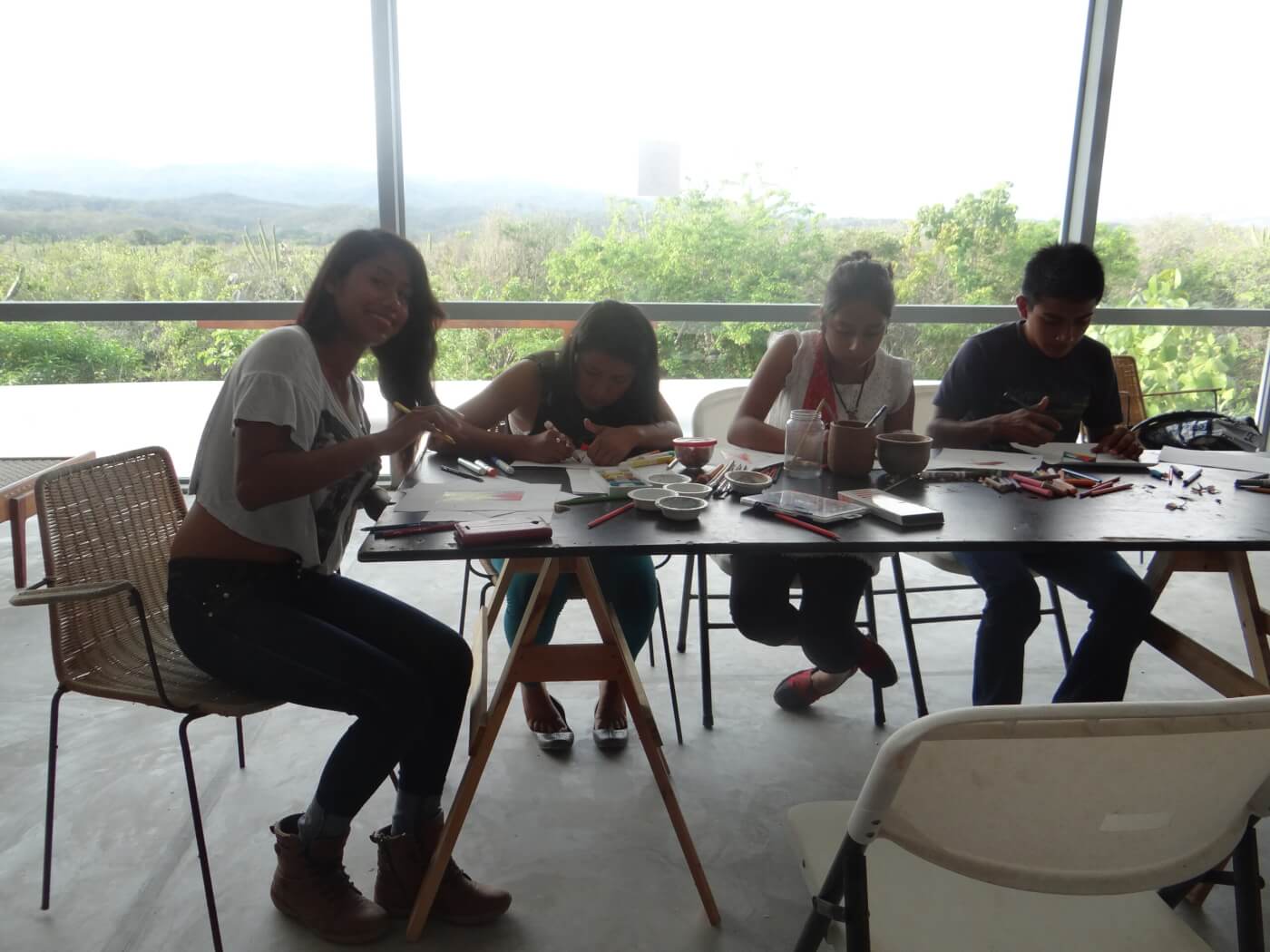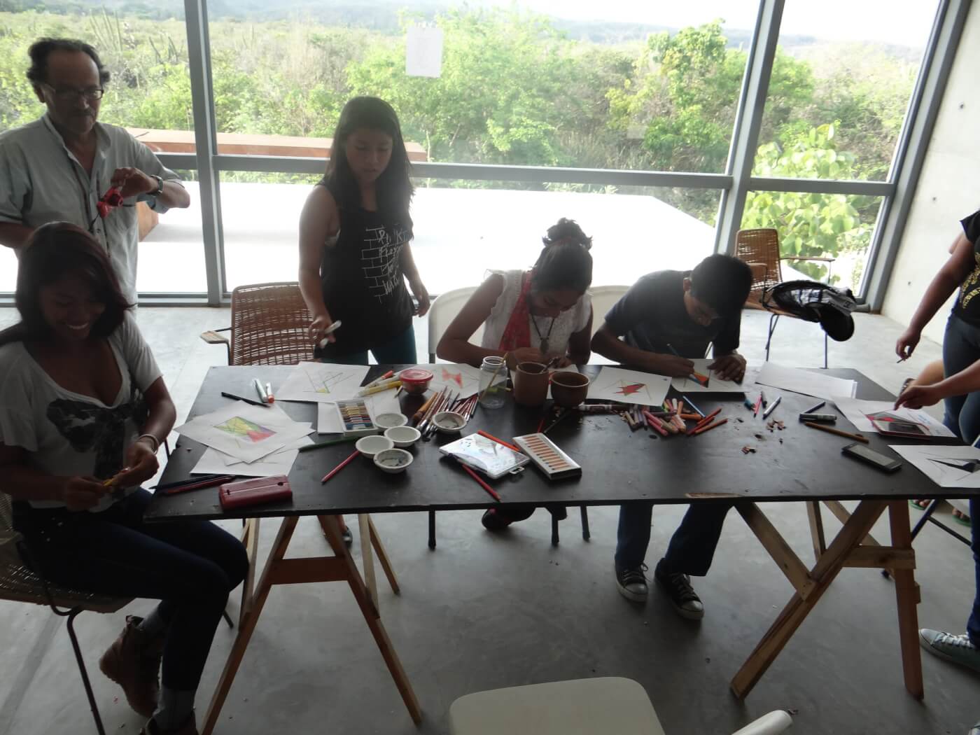 “Para este taller, hice uso de una práctica de magia renacentista, llamada “sigilo”, la cual refiere a un tipo de firma gráfica, que en la antigüedad servía para representar o el deseo de un mago o a un ente espiritual (benigno o maligno). En mi trabajo el uso de la técnica se aplica a la creación de un “sello” que represente gráficamente a aquellos grupos de música, trascendentes dentro de la visión espiritual de mi trabajo (Ej.. “Spiritualized”). Para el taller quise que los alumnos hicieran sus propios sigilos inspirados en sus grupos favoritos, trabajando de manera gráfica y directamente sobre el papel.” Txema Novelo, quien trabajó con jóvenes del Bachillerato Emiliano Zapata de Río Grande.